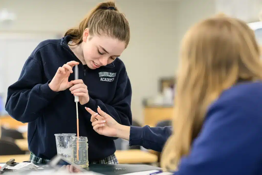 Intellectual curiosity is a hallmark of an Ursuline student. Asking “why” is at the heart of the study of science, and at Ursuline, students engage in the major scientific disciplines as well as enjoy the opportunity to explore other areas of science through an array of electives. Teachers rely on a variety of teaching methods to engage scientific inquiry, utilizing Ursuline’s well-equipped laboratory spaces to encourage exploration. Technology such as virtual reality is seamlessly incorporated to yield additional experiences that transcend the physical space, and students work together to develop collaborative strategies for design and problem-solving. Students graduate from Ursuline with a firm base of knowledge, in addition to critical thinking skills and analytical skills deepened through experimentation.